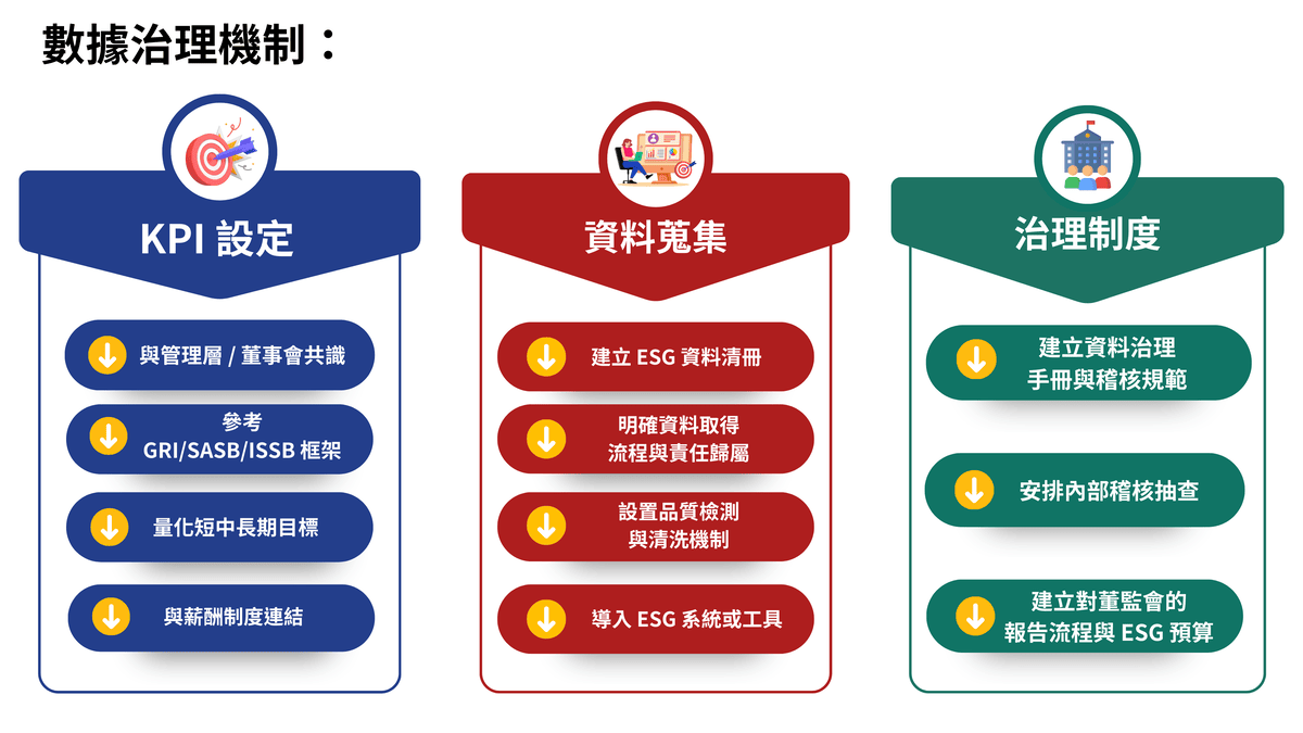 ESG 的管理與報告,完全建立在數據之上。如果數據來源混亂、品質參差不齊,那麼整份永續報告書的公信力就會大打折扣。因此,建立一套完善的數據治理制度至關重要: